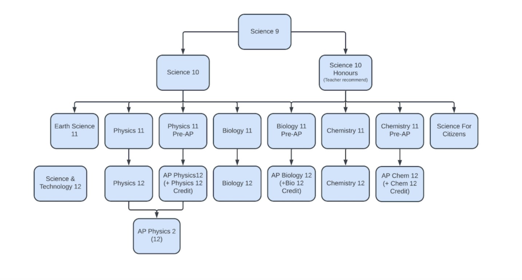 ブリティッシュコロンビア州にある高校のコースブックにある理科科目のコースの流れを図にしたものを参考までにご紹介します。全ての科目が全ての学校で行われている訳ではありません。一般的な大学進学のための科目は開催されていますが、特殊な理科科目やPre-AP/APは学校によりますのでご注意ください。