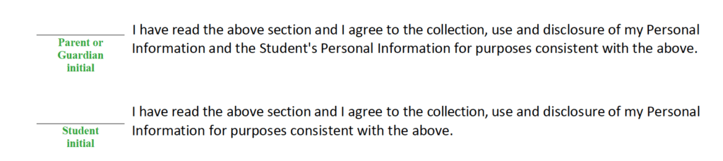 上記について理解をしたら、Parent or Guardian Initialに保護者のイニシャル(例:T.M)、Student Initialに生徒のイニシャル(例:Y.M)を記入してください。