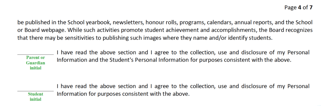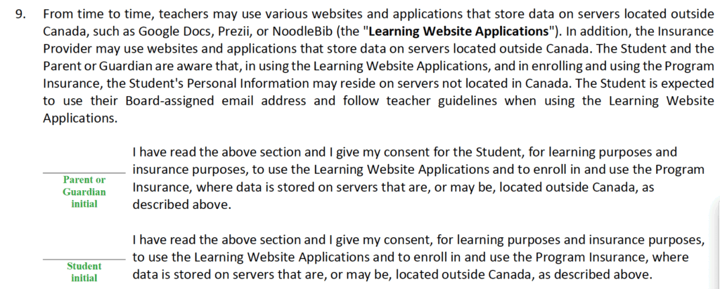 コモックス教育委員会では、Google Docs、Prezi、NoodleBibなどカナダ国外にあるサーバー上でデータを保存するウェブサイトやアプリケーションを使用することがあります。学生および保護者は、学習用ウェブサイトアプリの利用やプログラム保険への加入・利用において、学生の個人情報がカナダ国外のサーバーに保存される可能性があることを認識しています、という内容です。