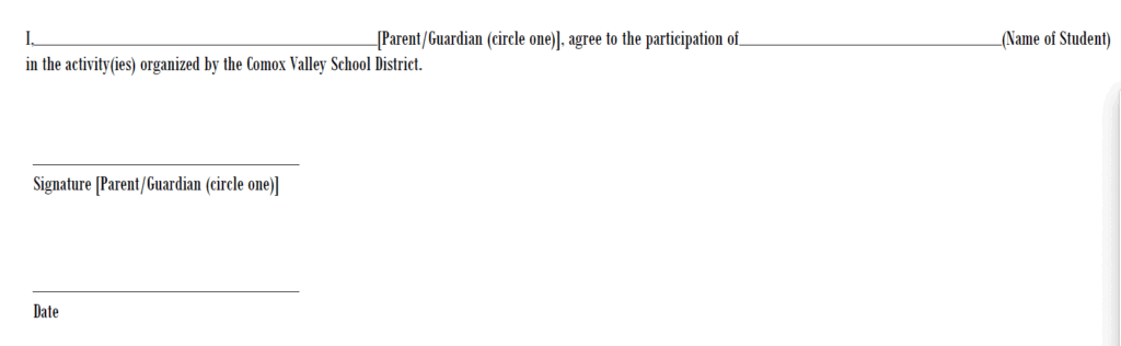 教育委員会が企画をするアクティビティへの参加同意書です。アクティビティには室内、屋外で行われるもの様々でどのアクティビティにもケガなどをするリスクが大なり小なりあります。それを理解した上で、アクティビティへの参加を許可しますという内容です。