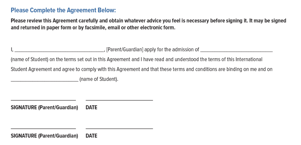 保護者が、州の法律、教育委員会・ホームステイの規約に則って子供が留学プログラムに参加することに同意する書類になります。運転、アルコール、ドラッグ、タバコの禁止、授業へきちんと出席をすること、25歳以上の大人が同伴をしないバンクーバー郊外への旅行の禁止など一般的な内容です。またルールを破った際には退学処分となる場合があり、その場合の授業料やホームステイ費用の返金はありません。