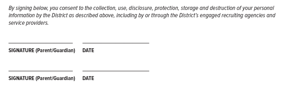 - Signature (Parent/Guardian) に保護者の署名を入れてください。2箇所ありますので、父親と母親それぞれの署名をお願いします。パスポートをお持ちの場合は、パスポートの顔写真に記載のある署名と同じものを入れてください。