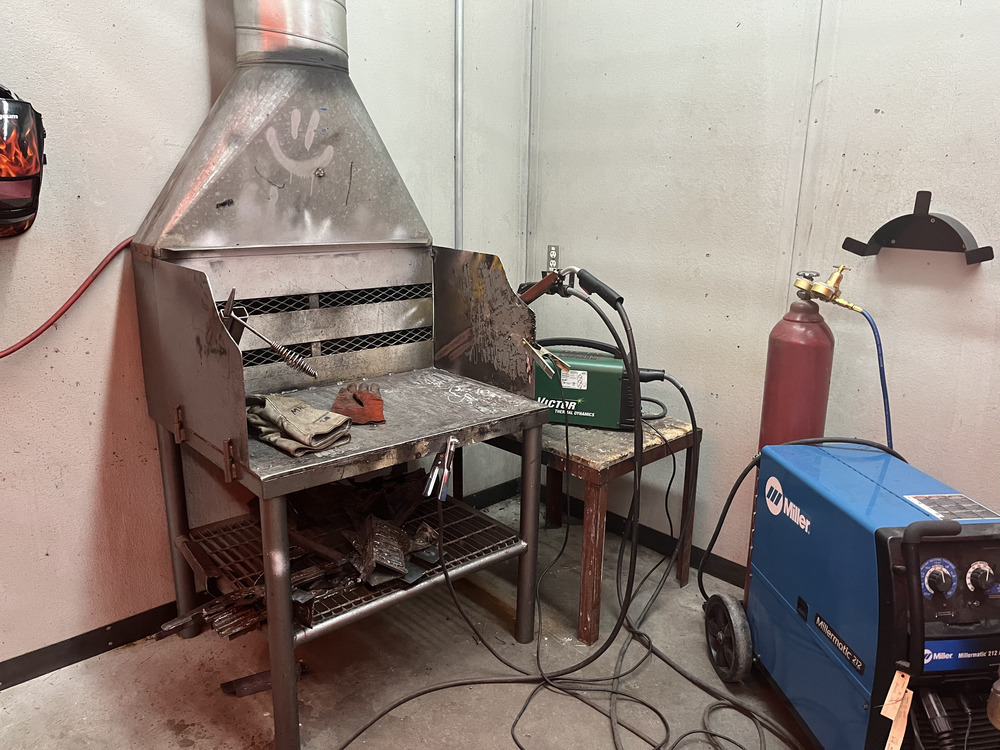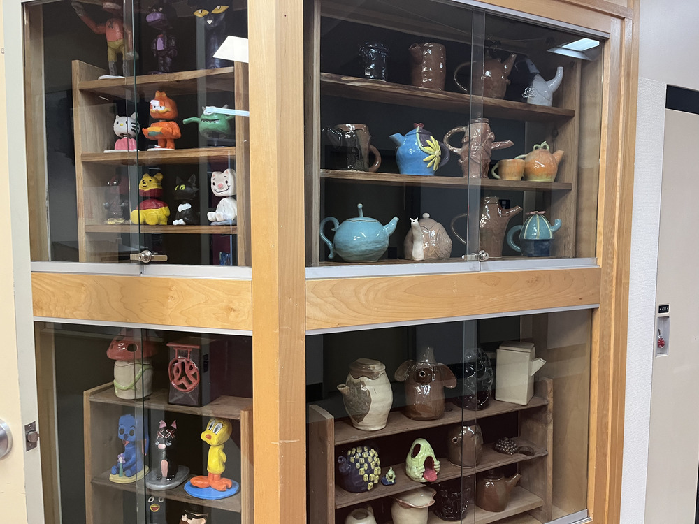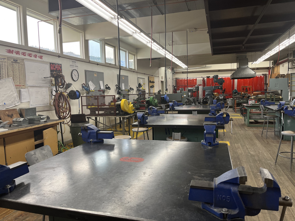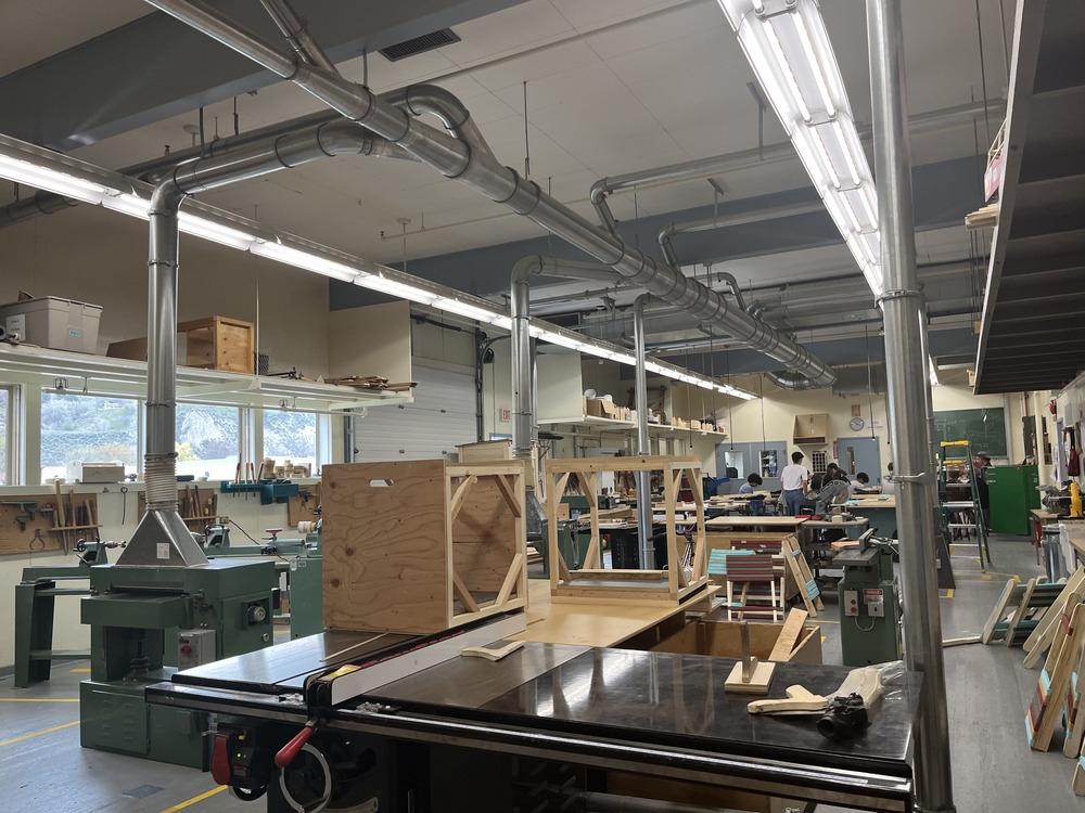ウッドワークの教室。奥の方で学生さん達が先生の指示を聞いて、それぞれに自分の制作に取り組んでいました。