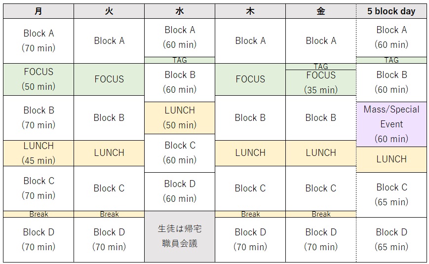 - 水曜は短縮授業、学校行事などのイベントのある日は「5 Block Day」の時間割を使用します。