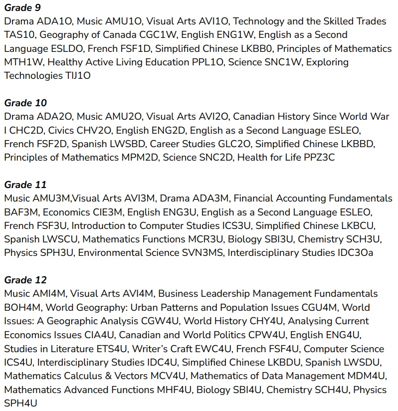 例:英語、数学、社会、科学、生活教育、芸術(音楽、視覚芸術、演劇)、第二言語(フランス語、スペイン語、簡体字中国語)、コンピュータサイエンス、会計、経済学、学際研究、ビジネス学、キャリアスタディなど
