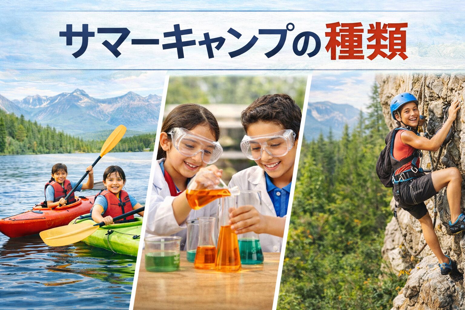 大切なのは、「何が一番良いか」ではなく、「お子さまに合っているか」という視点で選ぶことです。このページでは、代表的なサマーキャンプの種類と、それぞれの特徴・向いているケースを整理します。